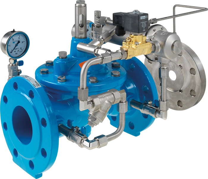 Vana de control / limitare a debitului menţine o valoare presetată maximă a debitului de la o zonă cu presiune mai ridicată la una cu presiune mai scăzută, în mod independent faţă de valorile variabile ale presiunii de funcţionare. Debitul nominal poate fi reglat în mod continuu prin intermediul vanei pilot, până la +/- 15%. Vana electromagnetică controlează umplerea şi golirea camerei pilot. Vana principală este deschisă atunci când intensitatea curentului este zero şi închisă atunci când prin ea circulă curent. Pentru a evita şocurile hidraulice, gradul de închidere poate fi reglat cu ajutorul vanei limitatoare de debit.