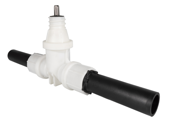 Vană de concesie POM cu două capete de ţeavă PE pentru sudură cu o grosime a peretelui ţevii SDR 11, în conformitate cu standardul DIN 8074. Sudarea vanei pe conducta PE poate fi realizată cu ajutorul metodei de sudură prin rezistenţă sau prin intermediul unui racord de sudură electrică.