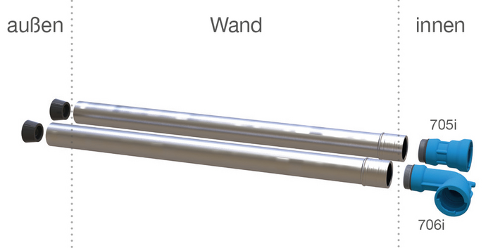 Instalarea penetrării pereților se realizează cu ajutorul a două garnituri spațiale inelar. Înainte de instalare, trebuie efectuată o forare corespunzătoare pe peretele de beton. (Sigiliile camerei anulare trebuie furnizate la fața locului și nu sunt incluse în domeniul de livrare.)